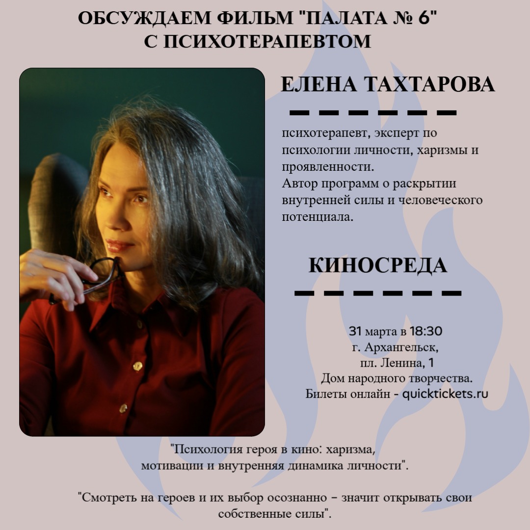 20:00 - обсуждение фильма с психотерапевтом. Елена Тахтарова, психотерапевт, эксперт по психологии личности, харизмы и проявленности (г. Архангельск).