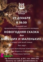 В программе концерта – популярные номера в исполнении лучших коллективов Архангельского музыкального колледжа. Юные зрители смогут услышать как народную, так и классическую музыку, встретятся с героями зимнего сказочного царства. А их родители смогут приятно отдохнуть под звуки полюбившихся всем традиционных новогодних композиций.