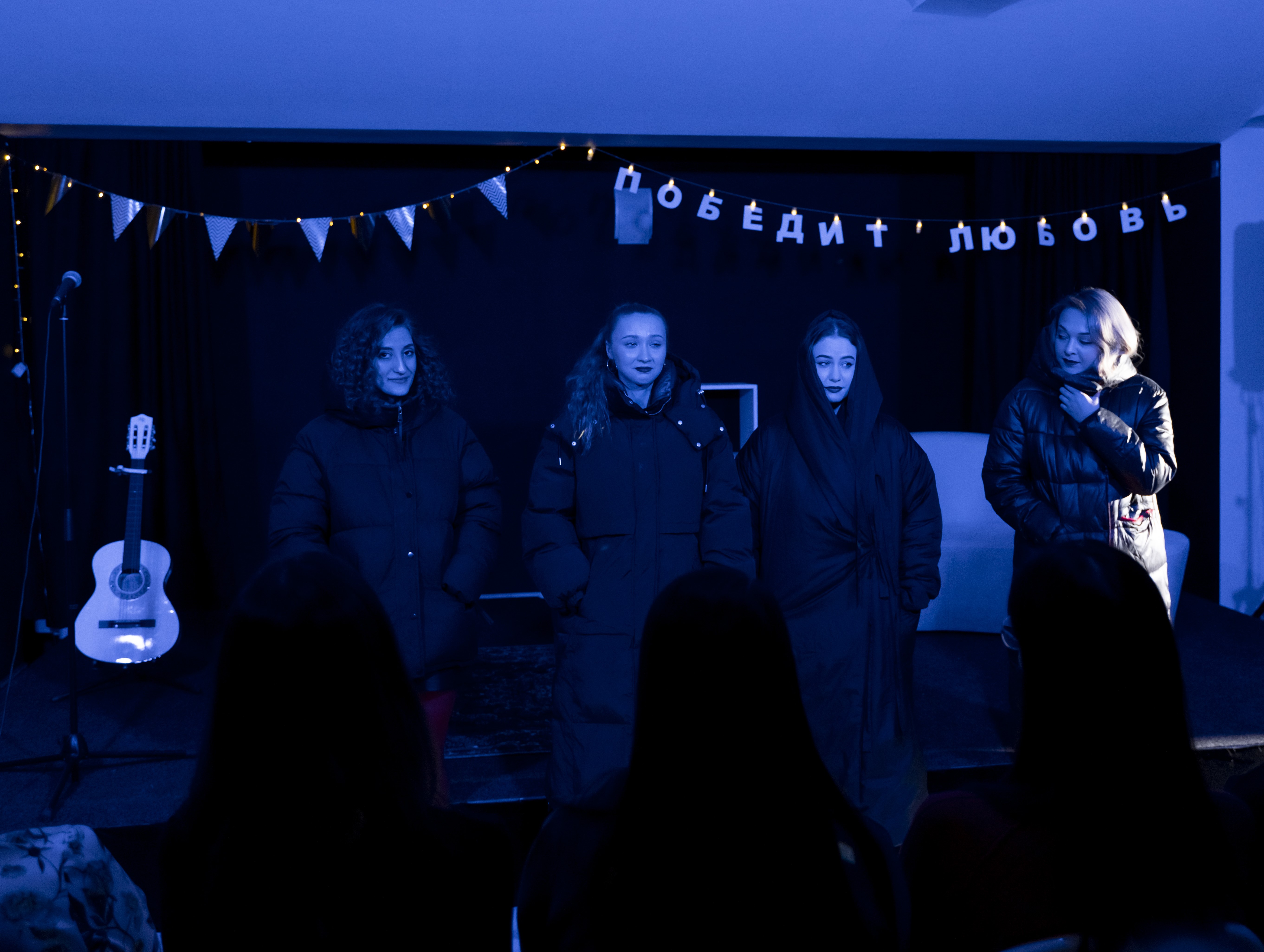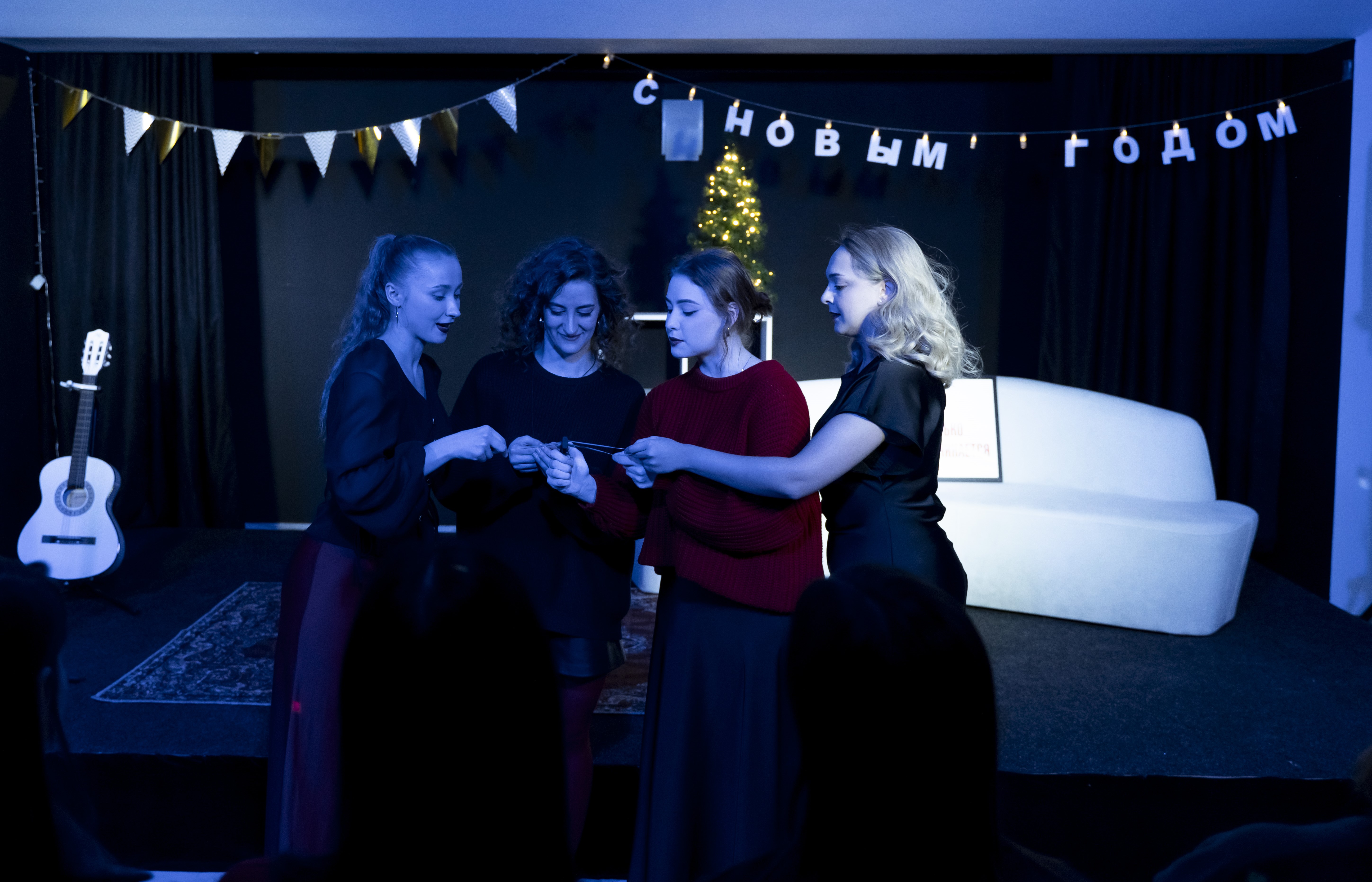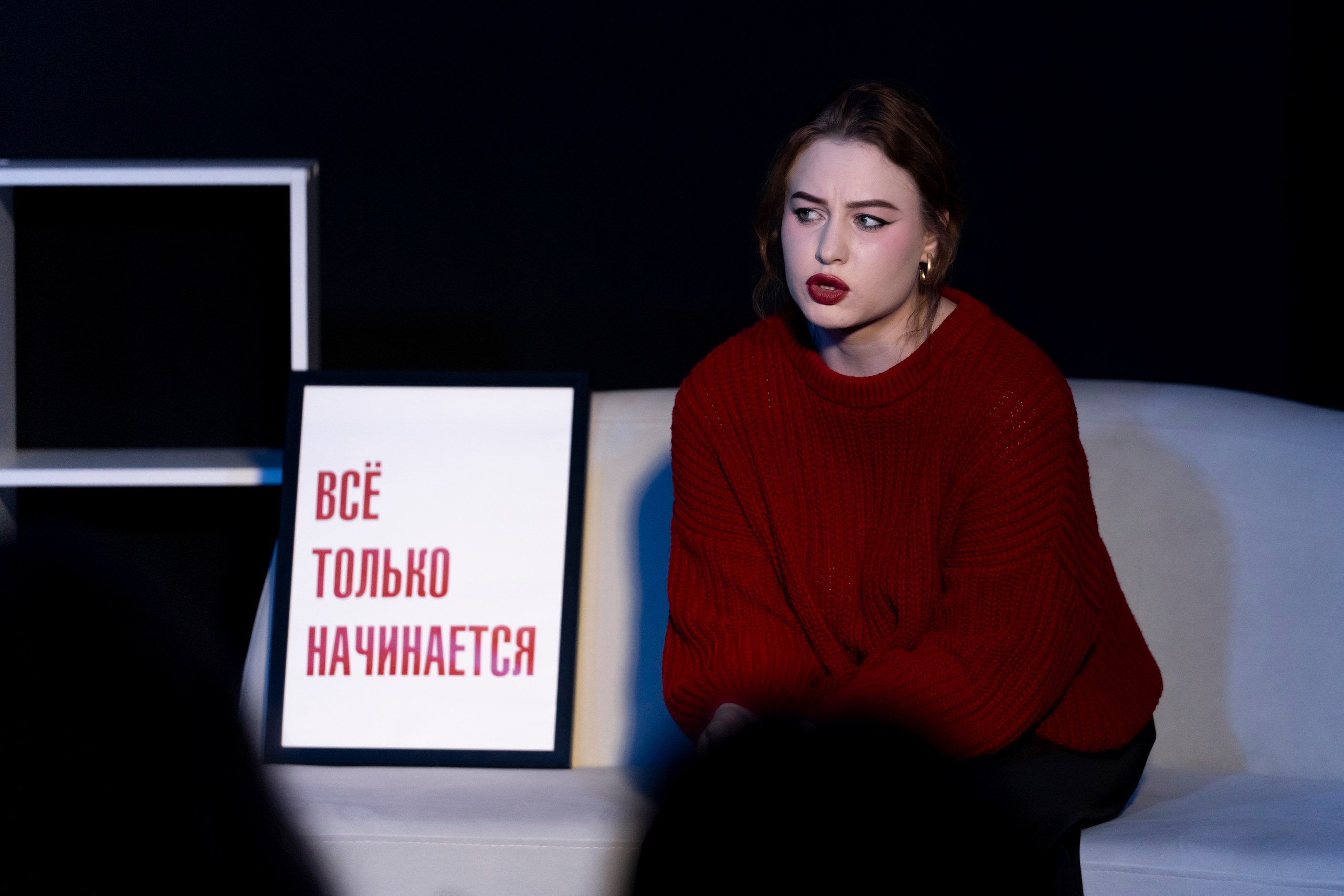 В спектакле играют: Дарья Никифорова, Яна Соколова, Елизавета Новикова, Мария Гнездова
