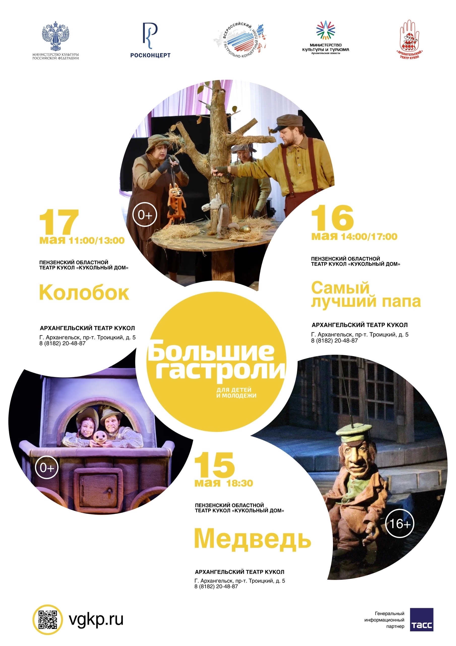 С 15 по 17 мая 2026 года состоятся «Большие гастроли» Пензенского областного театра кукол «Кукольный дом» в г. Архангельске, организованные ФГБУК РОСКОНЦЕРТ согласно Всероссийскому гастрольно-концертному плану Министерства культуры Российской Федерации. В рамках направления по поддержке детских и молодежных театров программы «Большие гастроли».