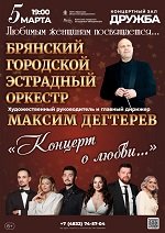 5 МАРТА 2026 года в 19:00, к/з "Дружба" Брянской областной филармонии. Брянский городской эстрадный оркестр под управлением художественного руководителя и главного дирижёра Максима Дегтерёва представляет концертную программу «Концерт о любви...», наполненную атмосферой особой теплоты и уважения ко всему прекрасному, что есть в женщинах.