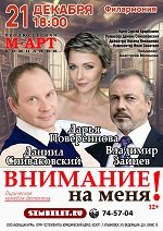 21 декабря 2025 года в 18:00, к/з "Дружба" Брянской областной филармонии. Спектакль "Внимание на меня". В современной жизни мы довольно часто сталкиваемся с тем обстоятельством, что чем старше мужчина, тем моложе его жена. Молодые девушки часто ищут себе в избранники мужчин намного старше их, и это совсем не означает, что они хотят скорее стать «юной» вдовой. Ведь взрослый мужчина – это стабильность, обеспеченность, сила, комфорт.
