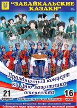 Государственный ансамбль песни и пляски «Забайкальские казаки» представляет яркую концертную программу ко Дню защитника Отечества. Зрителя ждет незабываемое представление, артисты Ансамбля подарят старинные казачьи песни в новом исполнении, а огненные казачьи пляски не оставят равнодушным даже самого искушенного ценителя искусства.