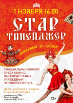 «Стартинейджер» – это командный танцевальный конкурс для учащихся школ и средних профессиональных учебных заведений города Чусового, где каждый участник сможет показать себя, свой талант и умение работать в команде. В этом году участников ждут новые яркие танцевальные конкурсы: визитная карточка, командный баттл "Ай-да пляска", домашнее задание на тему "Народный фристайл", а также танцевальный марафон "Карагод". По итогу всех этапов жюри выберет победителя. Этот яркий и зажигательный конкурс покажет, насколько дружны и музыкальны участники команд образовательных учреждений, насколько хорошо они знают народную культуру.