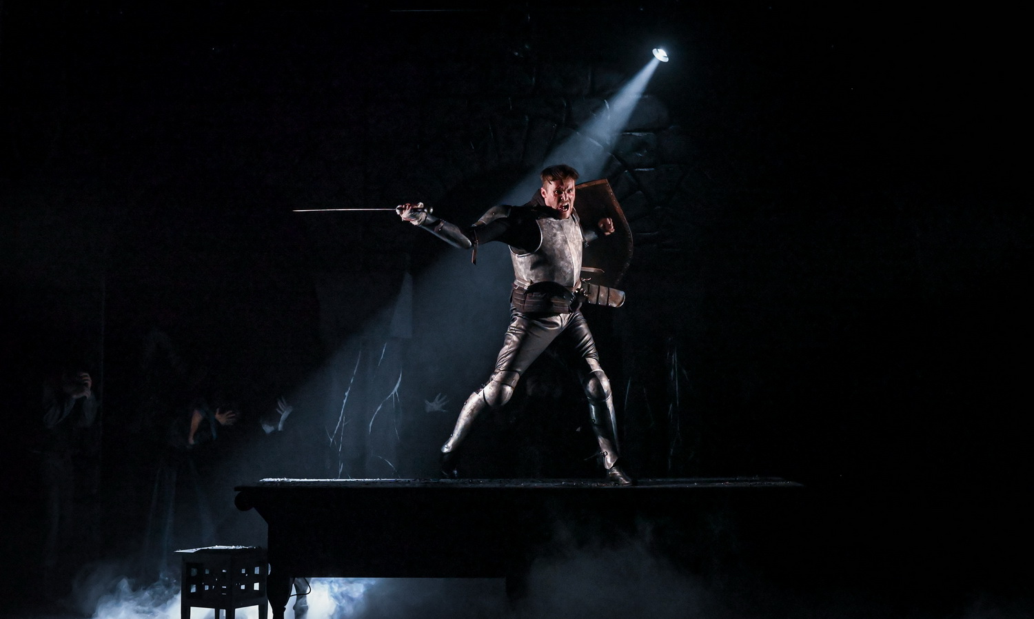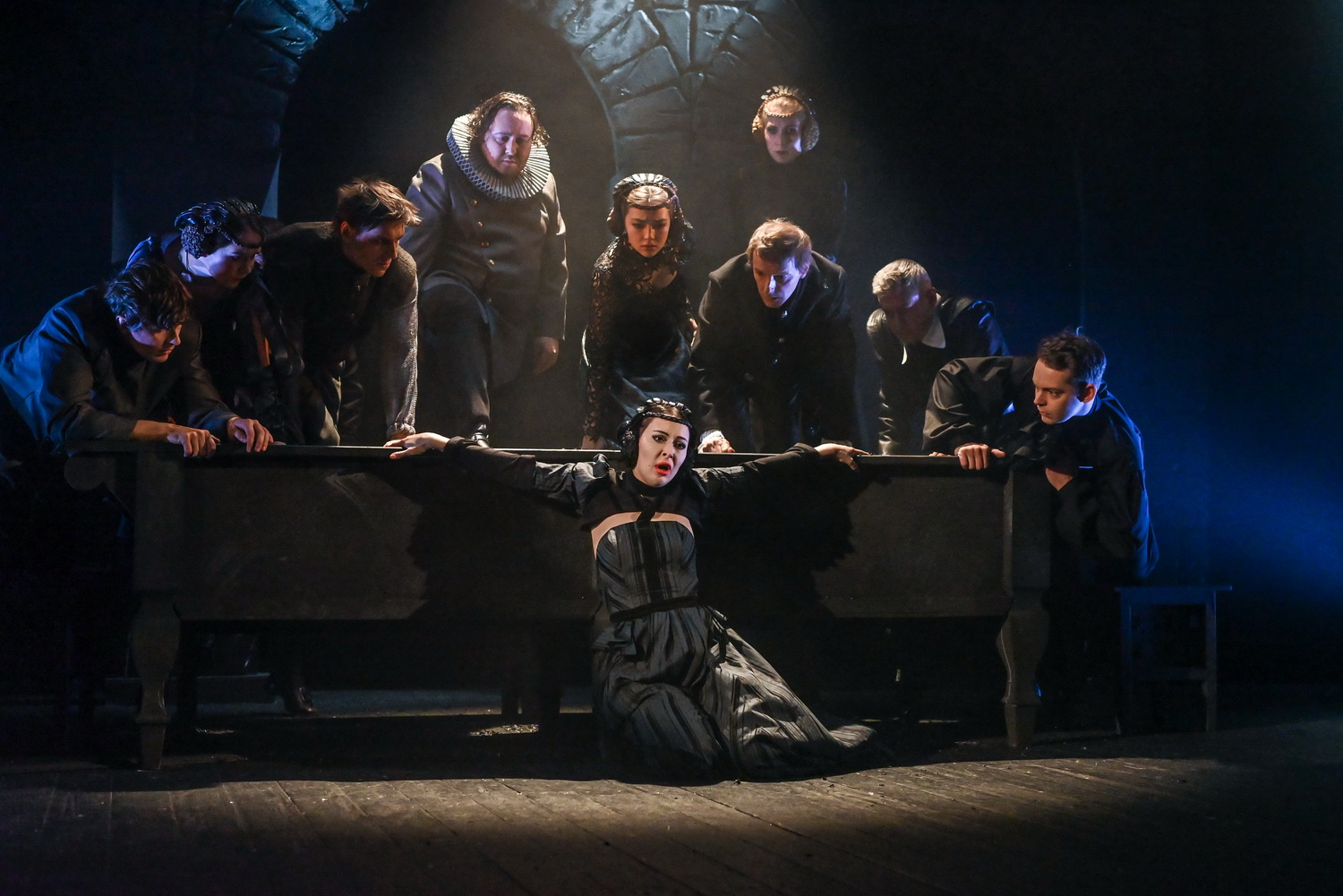 Собрав героев всего цикла за одним столом, словно оживив «Тайную вечерю» Да Винчи, Пермяков погружает зрителя в атмосферу «тёмного времени», когда свирепствовала чума. Андрей Олегович никогда не был режиссером одного приёма или стиля, но его почерк и перфекционизм различимы и в детских, и во взрослых спектаклях, но в «Трагедиях» режиссёр экспериментирует с пространством, временем и сознанием. Лаконичное художественное оформление спектакля (художник-постановщик Ольга Долгова) дополняет сумрачную среду обитания актёров и трагичность каждого из сюжетов. Но весь этот «пушкинско-пермяковский» диалог с Богом устремлён к одному – поиску света. Молитва и поиск истины, перерождение, через боль и утраты, душевные метания и вера, как символ надежды и абсолютной безусловной любви. Вместо реквизита, еды, воды, денег – один лишь пепел, вместо золота – стальные цепи и только оружие настоящее. Только сталь клинков и пепел остаются единственными партнёрами артистов на сцене. Место действия – огромный стол, как длань Господня. Именно на этой длани и происходит действие всех трагедий. В спектакле много образного и метафоричного. Так же много, как страстей в величайшем произведении Пушкина о человеческих пороках. Все четыре сюжета разыгрываются, как единое, целостное произведение, но при этом, локальные сюжеты каждой пьесы сохранены в первозданном виде.
