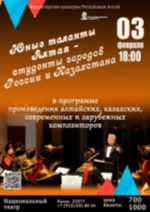03 февраля 2026 года на главной сцене Национального театра состоится концерт "Юные таланты Алтая - студенты городов России и Казахстана" в сопровождении Государственного оркестра Республики Алтай под руководством главного дирижера, заслуженного деятеля искусств Российской Федерации Владимира Кончева. В концерте принимут участие студенты музыкальных учебных заведений России; таких как Челябинский Государственный институт культуры, Новосибирская Государственная консерватория им. М.И.Глинки, Новосибирский музыкальный колледж им. А.Ф. Мурова, Санкт-Петербургской Государственной консерватории им. Н.А.Римского- Корсакова, Музыкальное училище имени Гнесиных. В программе – прозвучат произведения алтайских, отечественных и зарубежных композиторов.