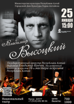 В день рождения Владимира Высоцкого пройдет концерт, посвященный музыке знаменитого артиста. В программе прозвучат знакомые многим культовые песни Владимира Семеновича. Солисты выступят под аккомпанемент Государственного оркестра Республики Алтай, главный дирижер — Владимир Кончев.