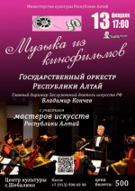13 февраля на сцене Шебалинского Центра культуры Государственный оркестр и мастера искусств Республики Алтай исполнят саундтреки из популярных кинолент "Берегись автомобиля", "Иван Васильевич меняет профессию", "Петербургские тайны", "Бриллиантовая рука", "Гардемарины вперед", "Игра престолов", "Дети капитана Гранта", "Бандитский Петербург", "Любовь и голуби" и многие популярные мелодии.