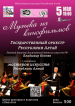 05 мая на сцене Центра культуры и искусств с.Кош-Агач, Государственный оркестр и мастера искусств Республики Алтай исполнят саундтреки из популярных кинолент "Берегись автомобиля", "Иван Васильевич меняет профессию", "Петербургские тайны", "Бриллиантовая рука", "Гардемарины вперед", "Игра престолов", "Дети капитана Гранта", "Бандитский Петербург", "Любовь и голуби" и многие популярные мелодии.