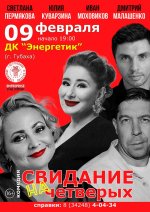 Столичное гастрольное агентство приезжает в Пермский край с комедией «Свидание на четверых». В основу спектакля легла пьеса «Нелётная погода...» сценариста и драматурга Алексея Щеглова. Зрителей порадует по-настоящему звёздный актерский состав: Светлана Пермякова, Юлия Куварзина, Иван Моховиков и Дмитрий Малашенко. За несколько лет сценической жизни спектакль завоевал зрительский успех и признание театралов от Калининграда до Петропавловска-Камчатского, сохранив свою актёрскую энергию и яркий актуальный юмор.