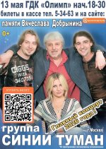 «СИНИЙ ТУМАН»- это не просто название известной песни, это НОВОЕ имя на нашей эстраде и новое звучание Ваших любимых шлягеров! Вас ожидает теплая встреча друзей, любителей настоящей, проверенной годами музыки- встреча, которая никого не оставит равнодушным, ведь на концертах группы «СИНИЙ ТУМАН» всегда только «живой» звук и только отличное настроение!