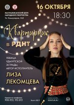 Гостем октябрьского квартирника станет Лиза Лекомцева — талантливая певица удмуртской эстрады и автор-исполнитель, в ее репертуаре 10 авторских песен.
