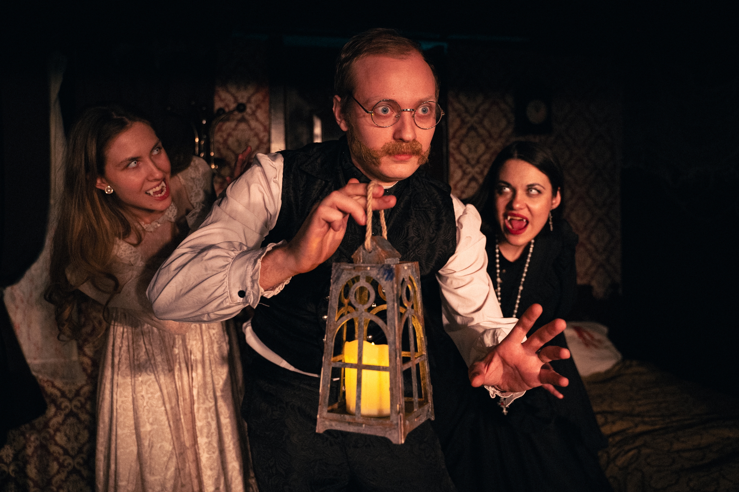 Дворецкий явно что-то скрывает и пытается накормить писателя весьма сомнительными блюдами. 🤢 А две очаровательные сестры, молящие о помощи, оказываются… вампиршами! 🧛♀️🧛♀️