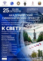Концерт симфонической музыки, который носит название «К Свету» посвящается 230-летию города Луганска и завершает XIV Московский музыкальный фестиваль «Светозвоны». В программе произведения композиторов И. Кайновой и В. Ульянича, которые покорили слушателей нашего города во время недавнего концерта «Поэтория. Дороги памяти» с большим успехом прошедшего в зале филармонии.