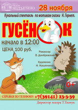 Интерактивный спектакль с весёлыми играми и песнями вовлечет ребят в добрую сказку, где каждый сможет стать не только зрителем, но и участником! Спектакль о том, как Еж и юные зрители помогают Аленке спасти озорника Гусенка из лап хитрой и коварной Лисы, о дружбе, взаимопомощи и любви.