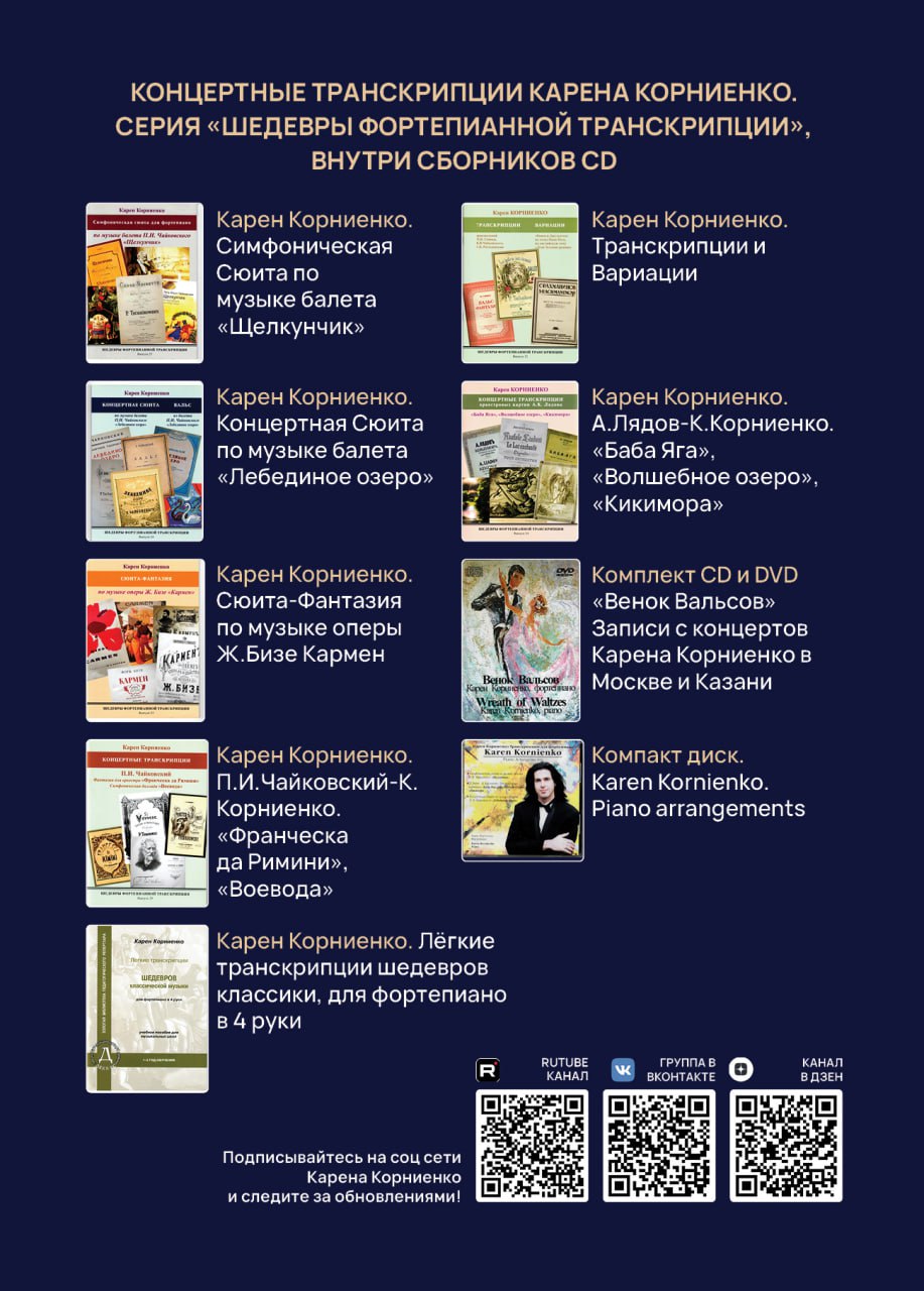 Дорогие друзья! Программа "Tchaikovsky. Rojal ballet gala" эксклюзивна и уникальна! В ней будут звучать яркие и запоминающиеся фрагменты балетов П.И. Чайковского. Она почти полностью, за исключением «Концертной Сюиты» по музыке балета «Щелкунчик» М. Плетнёва, состоит из виртуозных концертных аранжировок Карена Корниенко, получивших широкое признание во всём музыкальном мире.