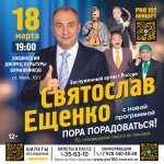 Святослав Ещенко – популярный комик, способный рассмешить зал с первой секунды, родился в День Смеха. Его лёгкий юмор создаёт позитивные эмоции и обладает оздоровляющим эффектом. Святослав Ещенко, являясь мастером перевоплощения, завоевал народную любовь в образах: Тамады, покусанного пчёлами, панка по кличке «Ирокез», продвинутой старушки Вовановны. В программе «Пора порадоваться!» вместе с новыми рассказами от полюбившихся персонажей Святослав представит зрителям стендап без мата: смешные истории о семейных отношениях, любви, финансах, наших гостиницах, поликлиниках, пешеходах и водителях, городе и деревне, и в целом о нашей жизни. В качестве бонуса – убойные анекдоты! Многое будет исполнено впервые!!!