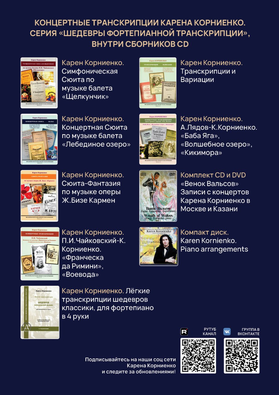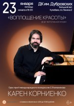 Пианист-виртуоз, композитор, транскриптор, обладатель Гран-при II международного конкурса имени С. Рахманинова (Москва, 1997), лауреат I и II международных конкурсов им. А.Скрябина, Карен Корниенко убеждён, что «музыка становится по-настоящему прекрасной только тогда, когда рождается в сотворчестве человека и Бога, воспевая красоту и творения Создателя». В свою программу музыкант включил произведения самых разных стилей и жанров, которые, по его словам, объединяет именно красота музыки! Ждём вас на встрече с Прекрасным!