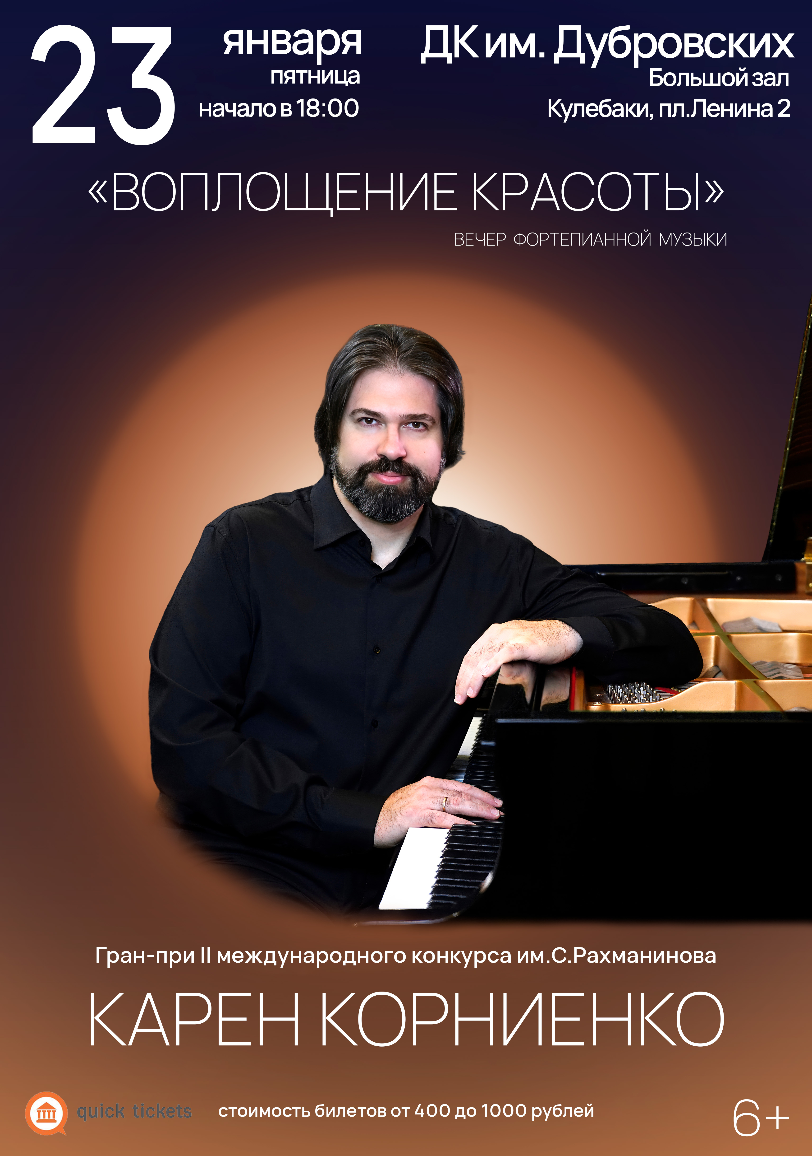 "Воплощение красоты". Концерт фортепианной музыки. Карен Корниенко. ДК им.Дубровских, г.Кулебаки 6+