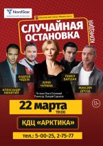 Московский театр «Мюзик-холл» продолжает гастрольный сезон премьерой комедии «Случайная остановка», которая будет показана, в г. Дудинка 22 марта 2026г. в 18:00 на сцене КДЦ «Арктика». Спектакль поставлен по пьесе «Остановка» писательницы и драматурга Ольги Степновой. Зрителей порадует по-настоящему звездный актерский состав: Александр Никитин, Андрей Чадов, Анна Чурина, Павел Баршак / Максим Дрозд.