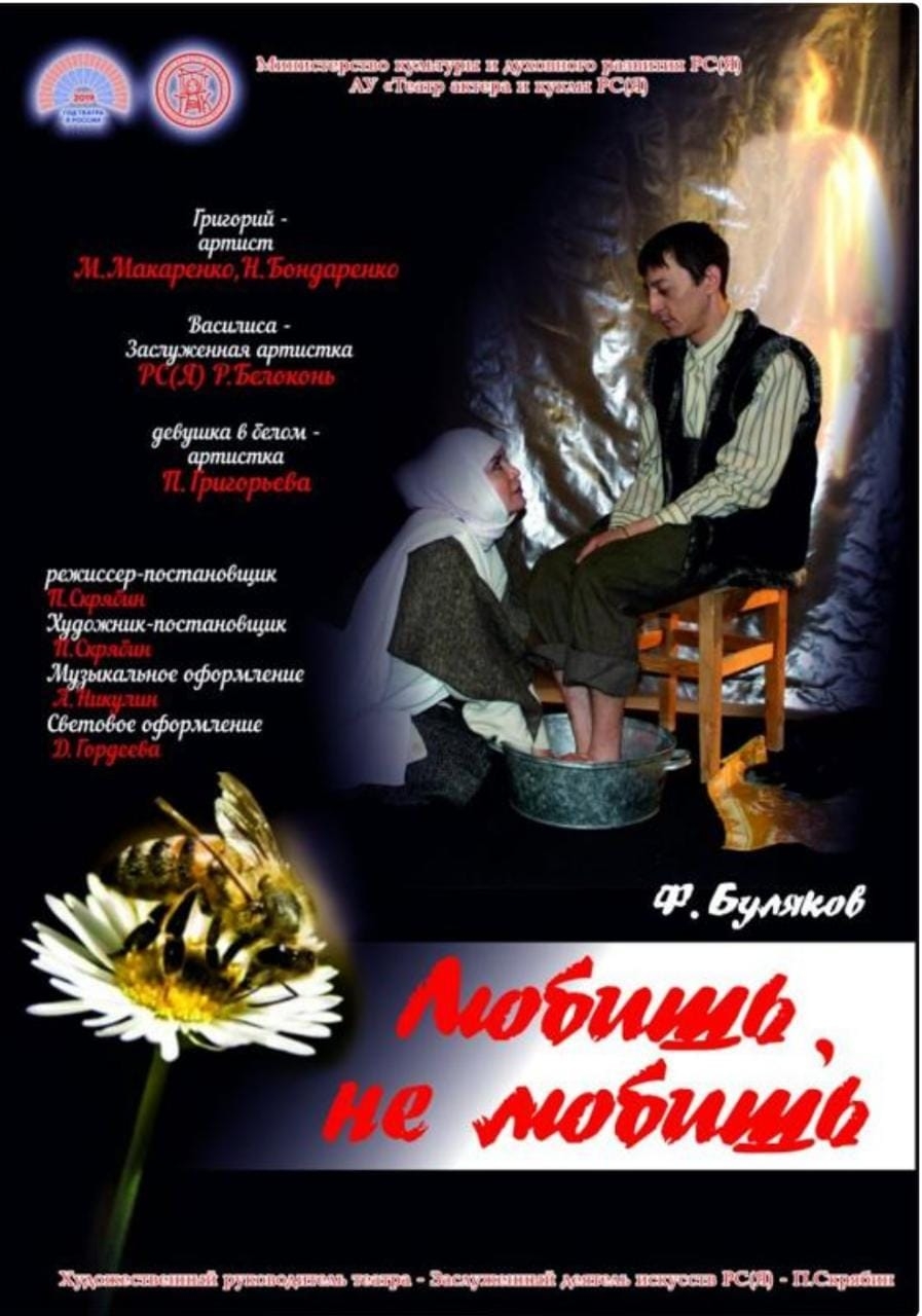 «Любишь, не любишь» (16+) драматический спектакль по пьесе Флорида Булякова. Спектакль о человеческой судьбе, судьбе мужчины и женщины, и конечно же, о любви. О любви очень сильной, длиною в целую жизнь, о любви, которая за долгие годы пережила и праздники, и будни, радость и горе. Героям казалось, что уже прожита жизнь и неизбежна смерть, но вдруг им выпадает шанс совершить богоугодное дело… В действие спектакля вклиниваются воспоминания о молодости героев Василисы и Григория, где была, кажется, и любовь, но было и такое, что зловещим эхом отозвалось в дальнейшей их жизни. Это история о долготерпеливой вере в то, что впереди обязательно ждет, что –то хорошее. Успеют ли герои ответить на вопрос – любит — не любит? Догадаются ли, что самое важное и святое…. Режиссер постановщик и художник — заслуженный деятель искусств РС(Я) Петр Скрябин. Премьера состоялась 24 ноября 2018 .