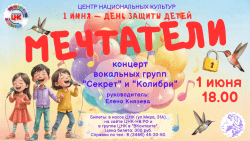 Центр национальных культур приглашает жителей и гостей города на концерт детских вокальных групп «Секрет» и "Колибри", посвященный Дню защиты детей. На мероприятии будут представлены как полюбившиеся композиции, так и новые песни. Яркие костюмы, театрализованные постановки, детская непосредственность и мастерство подарят зрителям хорошее настроение.
