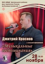 Солист арт-группы «Музыкальное кафе» Дмитрий Краснов приглашает на свой сольный концерт! 28 ноября, по счастливой случайности – в свой день Рождения – Дмитрий представит зрителю программу под названием «Музыкальные воспоминания».