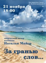 21 ноября в 18.00 в Доме творческих Союзов состоится авторский вечер поэтессы Натальи Майер. «За гранью слов...» - так назвала Наталья свой вечер и приглашает всех желающих.