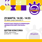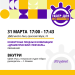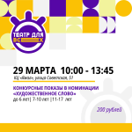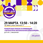 Фестиваль-конкурс «ТЕАТР ДЛЯ ВСЕХ» проводится с целью развитие детского любительского театрального искусства в городе Ноябрьске. КОНКУРСНЫЕ ПОКАЗЫ ПО НОМИНАЦИЯМ: - Драматический спектакль; Инклюзивный театр; Литературно-музыкальная композиция; Художественное слово. В конкурсных показах принимают участие воспитанники детских любительских театральных коллективов города Ноябрьск.