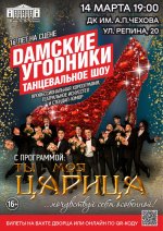ТЫ - МОЯ ЦАРИЦА! Уникальное мужское шоу «ДАМСКИЕ УГОДНИКИ» с новой программой для женщин! Вы погрузитесь в увлекательный мир театра, танца и искрометного юмора! Вас ждут яркие, лирические и юмористические танцевальные постановки и смены образов, потрясающее музыкальное сопровождение, зажигательная игра ведущих и артистов со зрителями, цветы, подарки и возможность сфотографироваться с артистами прямо на сцене! Продолжительность 2ч., без антракта