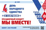 4 ноября в День народного единства приглашаем на праздничный концерт, чтобы еще раз сказать: «Мы вместе!» Через стихи, танцы, песни, яркие видео поговорим об основных факторах единства нашего народа это: история, патриотизм, культура и традиции. Стоимость билета 200 рублей. Покупка билетов только онлайн.