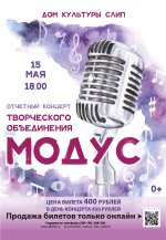 Отчетный концерт творческого объединения «Модус» - это яркая, красочная, разнообразная программа для истинных поклонников вокального творчества. Это атмосфера истинного музыкального праздника. Спешите купить лучшие места и подарить себе незабываемый вечер в компании талантливых исполнителей! Предварительная продажа билетов: 400 рублей, в день концерта - 450 рублей. Дети до 3-х лет бесплатно (без места).