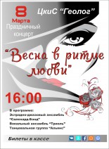 Центр культуры и спорта "Геолог" приглашает на праздничный концерт "Весна в ритме любви", посвященный Международному женскому дню 8 Марта!