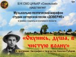 Музыкально-поэтическая гостиная "Окунись душа в чистую волну" - это цикл мероприятий в форме тематических вечеров, посвященных творчеству вологодских поэтов: А. Романова, Н. Рубцова, П. Рожновой и др. В программу мероприятия войдут музыкальные концертные номера в исполнении Народного самодеятельного коллектива Студия авторской песни "Доверие", а также исполнителей самодеятельного творчества.