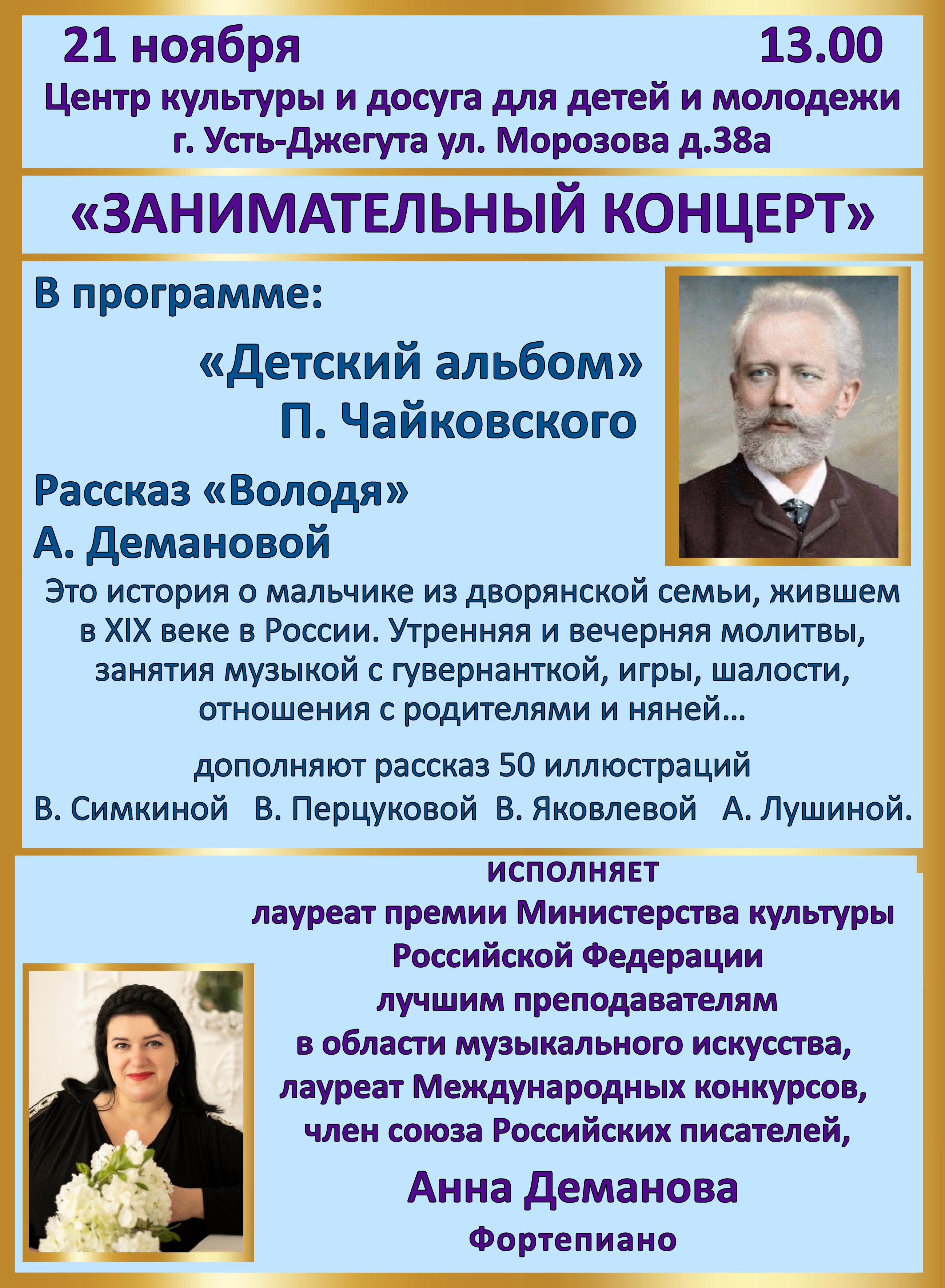 Концерт проводит лауреат премии Министерства культуры РФ лучшим преподавателям в области музыкального искусства, лауреат Международных конкурсов, член Российского союза писателей, педагог Анна Деманова.