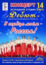 На сцене Народный самодеятельный коллектив Амурской области эстрадная студия «Дебют» художественного руководителя Анатолия Лободы с новой концертной программой. В этом концерте участники коллектива представят зрителю все многообразие своего репертуара. В программе прозвучат песни о патриотизме и любви к родине. В концертной программе прозвучат народные песни, эстрадные песни как в сольном исполнении, так и коллективном исполнении. Украшением концерта станут номера солистов, которые доставят зрителю новые впечатления и положительные эмоции.