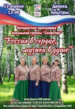 Концерт «Россия в сердце, музыка в душе» вокальной группы «Созвучие» — это тёплая дружеская атмосфера, нарядные и задорные исполнительницы и конечно же, любимые песни, которым хочется подпевать. Каждая из участниц коллектива «Созвучие» искренне влюблена в русскую песню и вокальное искусство. В программе прозвучат песни о России, о доблести русского воина, и конечно песни о любви. В концертной программе примут участие хореографические коллективы города Свободного, выступление которых никогда не оставляют зрителей равнодушными.