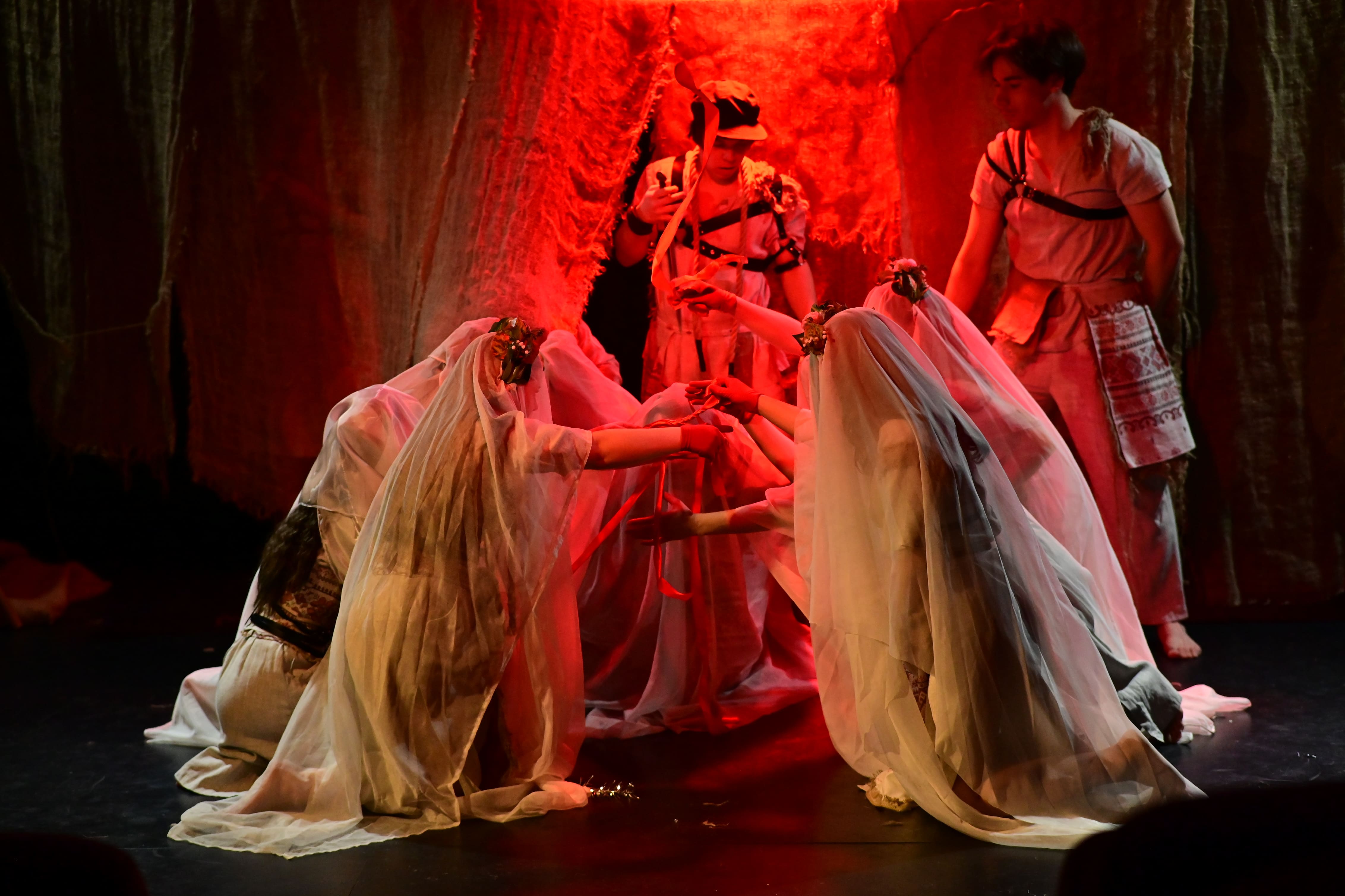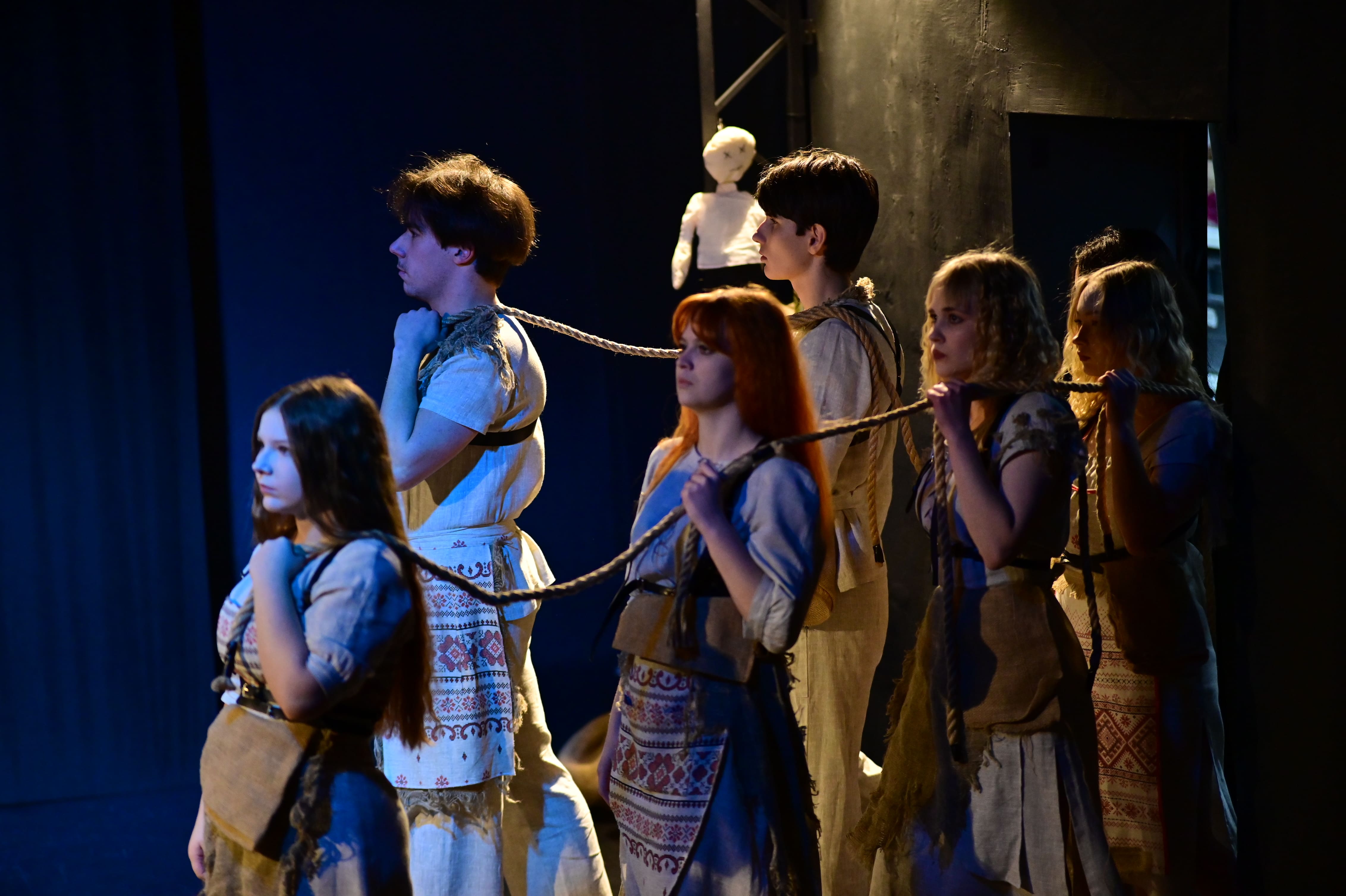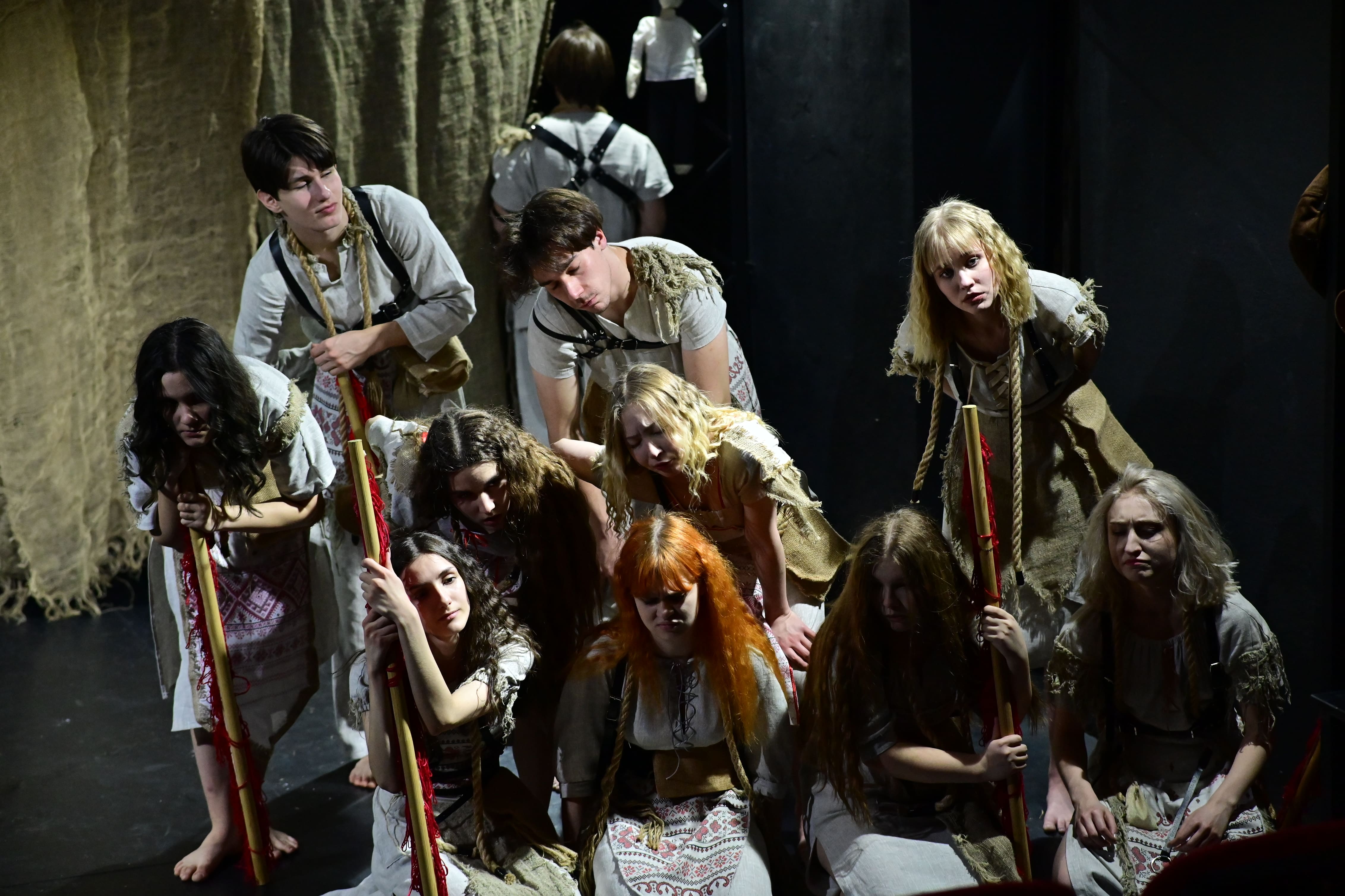 Меня приятно удивило, что кроме самого действия, зачитывали и пейзажные отрывки из Гоголя. И говорили все "старинным" языком без трудностей и с нужными интонациями. Единство образа костюмов также подсказывает, что воспринимать это стоит символически, актёры показывают не сами сказания и их героев, а сутевой ряд сказаний. Подобное в более строгом антураже я видел в театре "На досках" у Кургиняна.