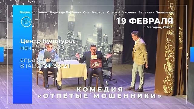 Заслуженный артист России Вадим Колганов, Олег Чернов, Надежда Паршина и другие звёзды российского театра и кино в спектакле "Отпетые мошенники" 19 февраля 2026 г. в 19:00 на сцене Центра культуры г. Магадана. Удивительная жизнеутверждающая комедия по мотивам произведений О.Генри напомнит зрителю о том, что на всякого мудреца довольно простоты, а на всякого хитреца – найдётся другой, особенно, если в дело вступает женщина… Зима закончится, а яркие эмоции и положительные впечатления останутся!