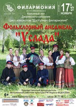 Ансамбль «Услада» был создан в 1998 году. Это фольклорный коллектив с необычным и очень современным имиджем. Его артисты - одновременно и певцы, и драматические актеры, и исполнители сложных хореографических композиций. Секрет успеха «Услады» - в глубоком и профессиональном понимании традиционной русской культуры. Артисты изучают русскую песню в этнографических экспедициях, собирают предметы крестьянской старины. Они ищут и находят исторически точный подход к музыкальной архаике и стремятся к художественному преломлению народного творчества средствами современного искусства.