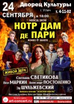 Мюзикл-шоу «Нотр Дам де Пари» - это яркая, динамичная, костюмированная театрализованная программа, в которой не просто звучат арии из знаменитых мюзиклов, а демонстрируются отрывки из спектаклей, которые связаны между собой в единую историю интересным конферансом. Первое отделение - это легендарная история «Нотр Дам де Пари», а второе отделение - история Ромео и Джульетты. Две потрясающие истории в одной программе. Только «живое» исполнение!