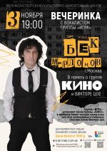 3 ноября в 19:00. 4 часа чистого кайфа и любимых хитов! Для вас выступит московский артист Бек Марданов - участник группы «Игра» - с программой, посвященной Виктору Цою и группе «Кино».