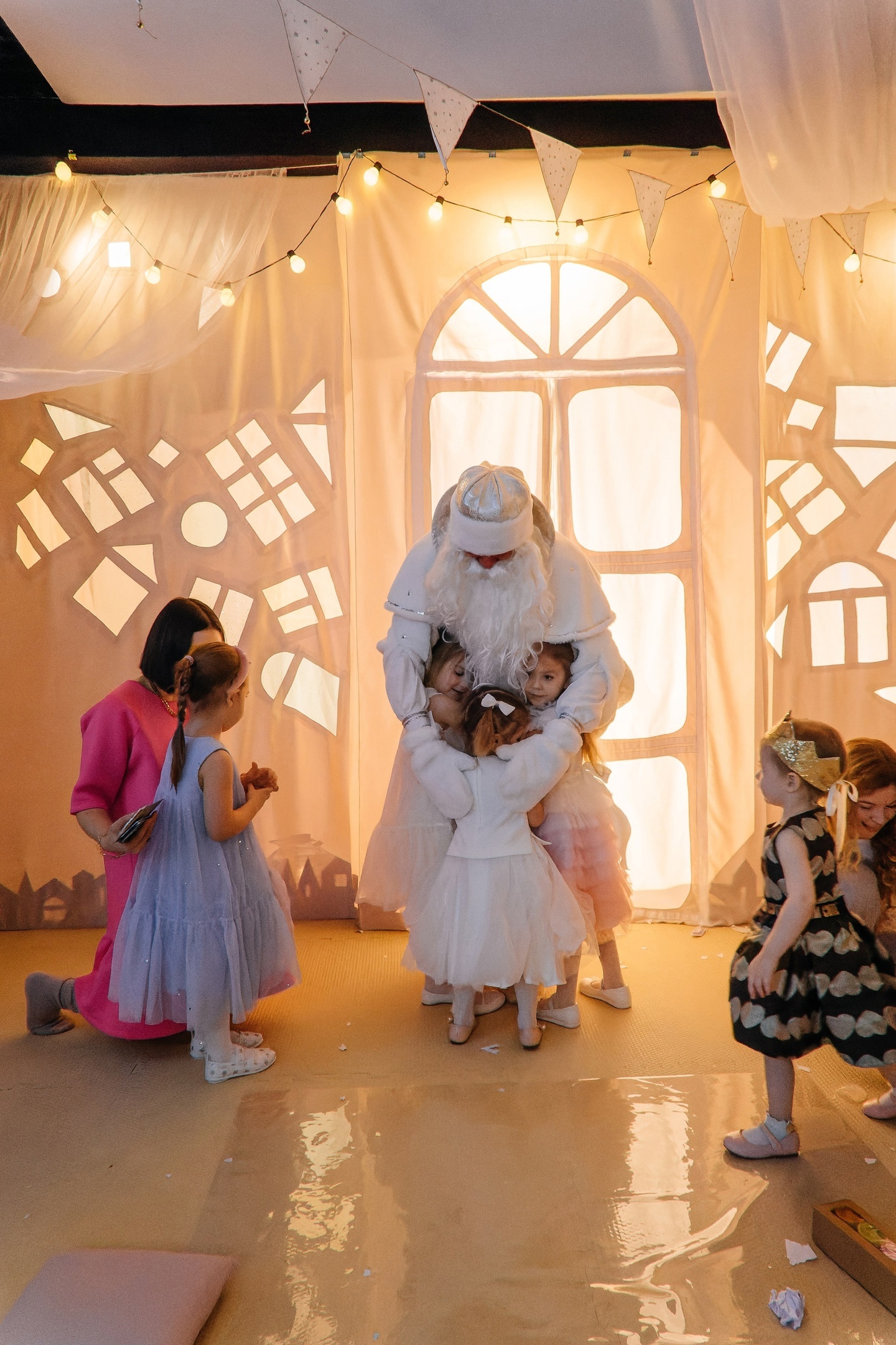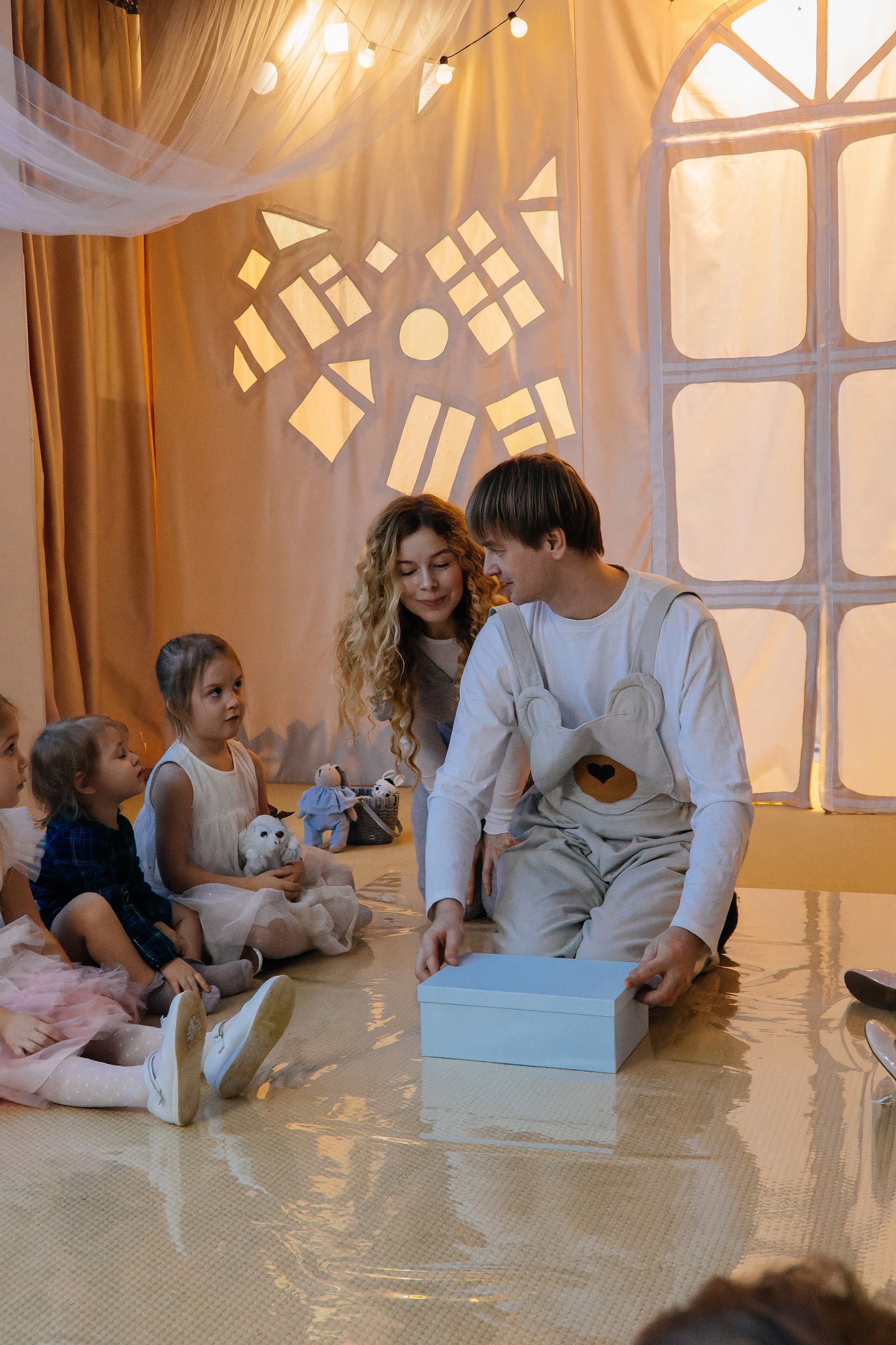 Спектакль как один большой мастер-класс. С нашими маленькими зрителями мы с самого начала истории придумываем, из чего можно сделать снег, чтобы объяснить Жирафчику, герою этой истории, что такое снег и на что он похож. Разглядываем волшебные снежные шары, вырезаем из бумаги снежинки, устраиваем метель, катаемся на санках, лепим из теста, запускаем мыльные пузыри. И после всего этого уже не понимаем, а кто же всё таки герой этой сказки, Жирафчик или наши маленькие, любознательные зрители, которые весь спектакль были с нами на одной сцене?