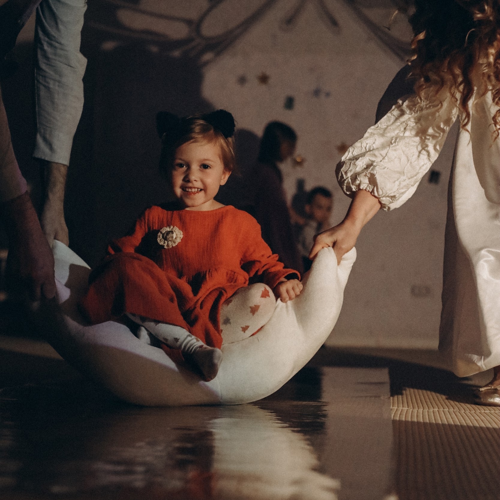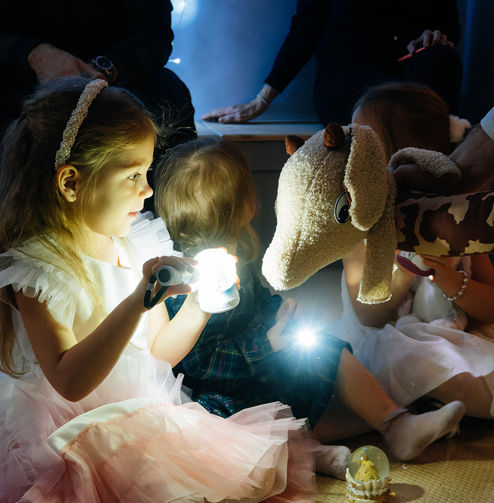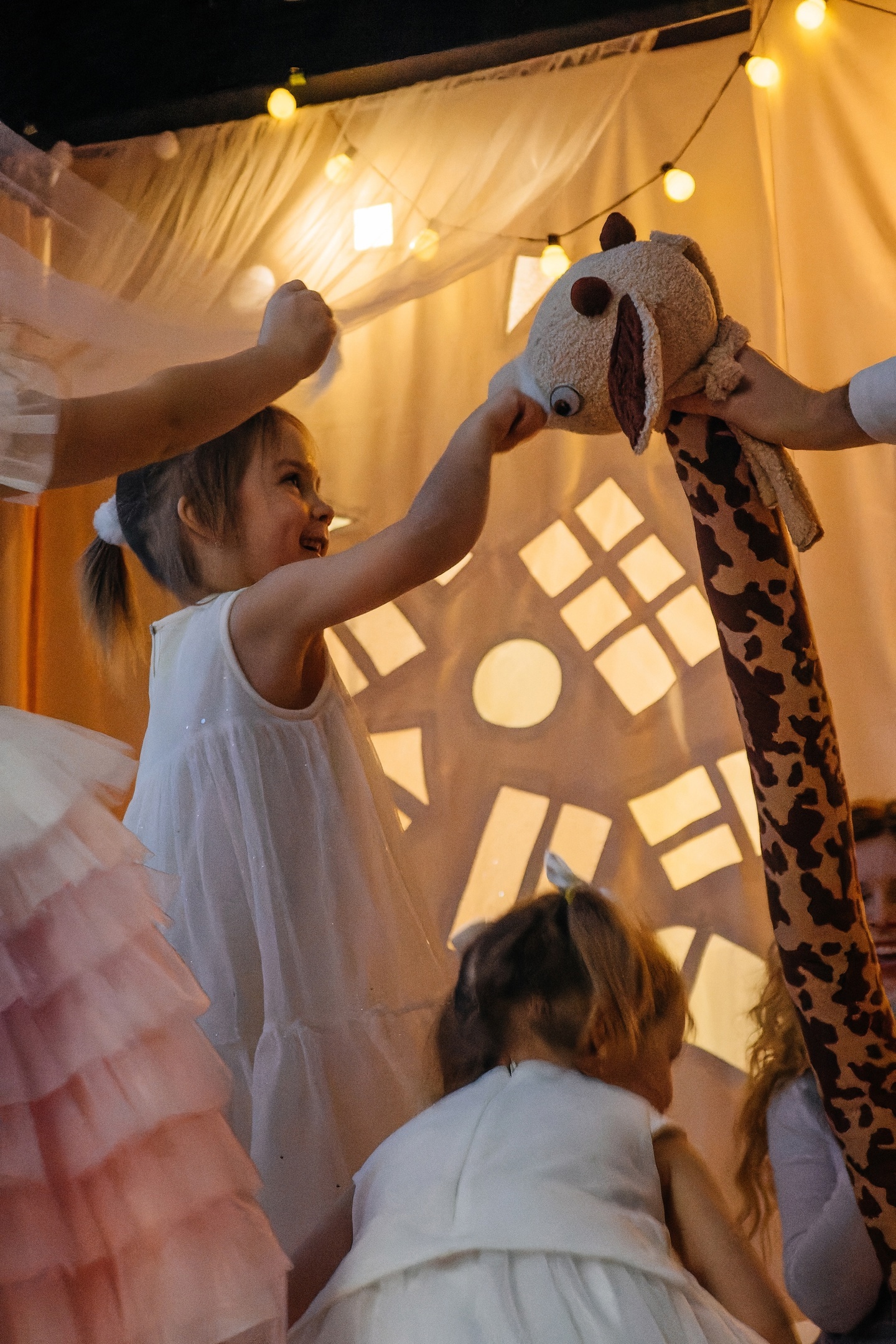 Спектакль как один большой мастер-класс. С нашими маленькими зрителями мы с самого начала истории придумываем, из чего можно сделать снег, чтобы объяснить Жирафчику, герою этой истории, что такое снег и на что он похож. Разглядываем волшебные снежные шары, вырезаем из бумаги снежинки, устраиваем метель, катаемся на санках, лепим из теста, запускаем мыльные пузыри. И после всего этого уже не понимаем, а кто же всё таки герой этой сказки, Жирафчик или наши маленькие, любознательные зрители, которые весь спектакль были с нами на одной сцене?
