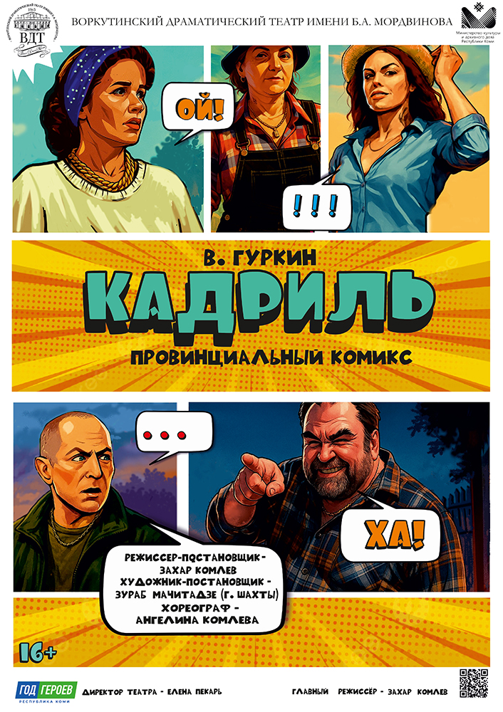 Спектакль по пьесе «Прибайкальская кадриль» (год написания – 1996) российского драматурга Владимира Гуркина, ставшего всенародно известным по пьесе «Любовь и голуби», на воркутинской сцене стал просто «Кадрилью», ведь такая история могла произойти в любом уголке России. Драматург рассуждает о важных перипетиях жизни с острым и в то же время добрым юмором, а режиссёр Захар Комлев с постановочной группой и ведущими артистами театра сделали её поистине искромётной народной комедией!