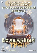 Театрализованное представление по пьесе В.В Панфилова погружает зрителей в настоящую сказку. В ней каждый станет равноправным участником спектакля, в котором герои сражаются за Волшебный трон, чтобы стать королем или королевой, спящего много тысяч лет королевства. Вместе с главными героями: Ягой и ее сыном, Кощеем и его дочкой ребята и взрослые разгадают тайну волшебного трона. И, конечно же, в преддверии Нового года встретятся с главными добрыми волшебниками Дедом Морозом и его внучкой Снегурочкой. Яркое представление с концертными номерами, волшебным музыкальным и световым оформлением, фантастическими преображениями, обязательно создадут особую сказочную атмосферу добра, счастья и радости и поднимут зрителям настроение.