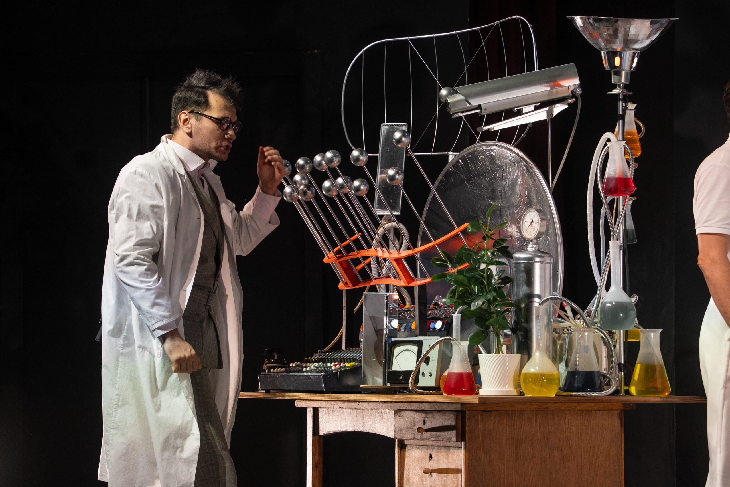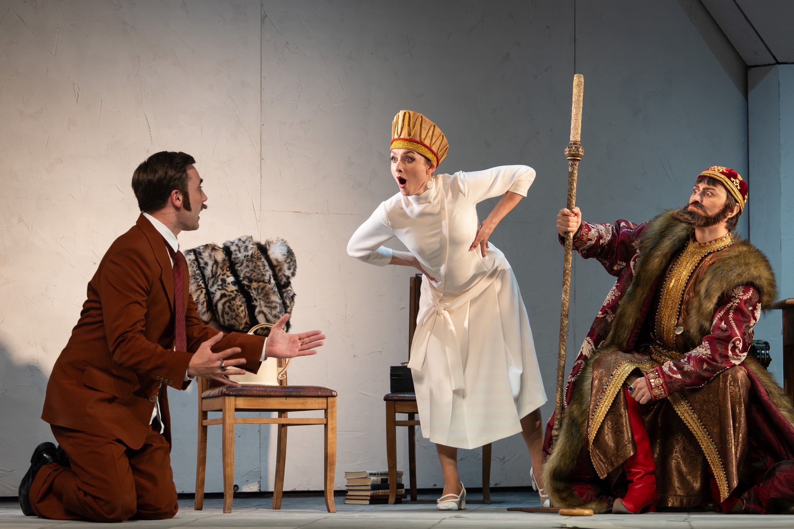 С первых же минут зритель погружается в яркую, масштабную историю. Вернее, происходит это ещё в фойе. Благодаря великолепной работе художника-постановщика Кирилла Пискунова, машина времени изобретателя Тимофеева - это не просто условный аппарат, а полноценный участник действия. Московская коммуналка с ее уютным хаосом мгновенно и зрелищно превращается в роскошные покои царя Ивана Грозного. Декорации живут и дышат, становясь то советским бытом 30-х или 70-х (действие в комедии Гайдая перенесли именно в это время), то русским Средневековьем. Этому же способствуют и великолепные костюмы, и виртуозная работа художников по свету (Алексей Тарасов) и видеоарту (Илья Шушаров, Ирина Крупская). Кажется, что ты и впрямь переносишься во времени вместе с героями.